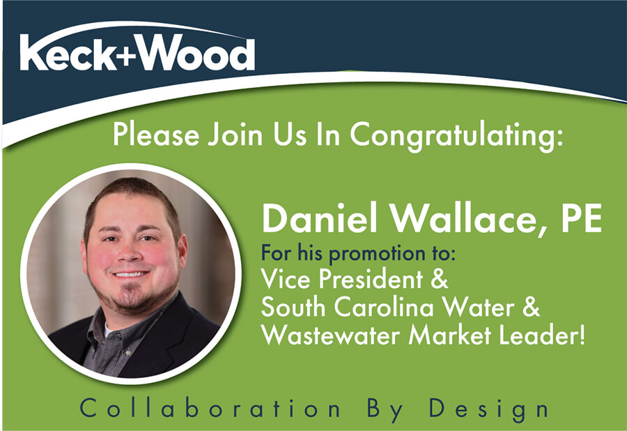 Being recognized by your peers for talent and skill is truly humbling. Congratulations to Daniel Wallace, PE for his promotion to Vice President and Market Leader in Keck & Wood’s South Carolina Water & Wastewater Practice! Having been with Keck & Wood for sixteen years, Daniel’s achievement is well-deserved and a direct result of his hard work and client dedication. Serving from the Rock Hill, SC office, Daniel brings clients extensive experience in water, wastewater, stormwater, and site development projects.