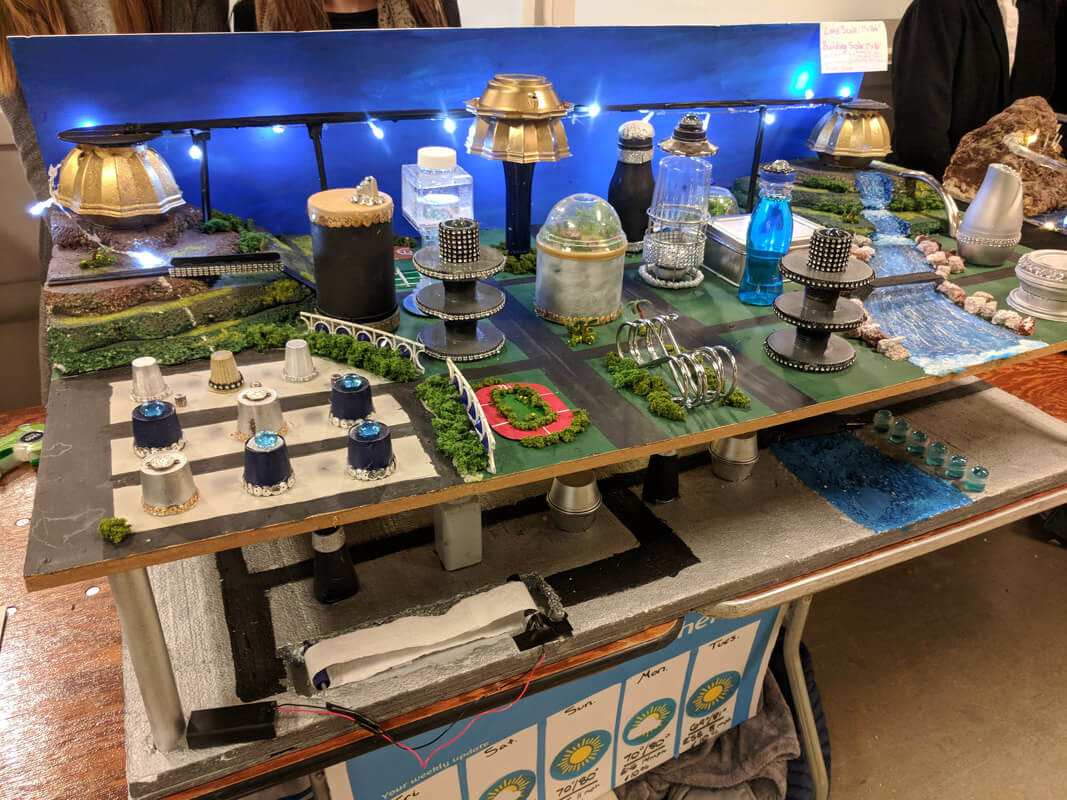 In the Future City Competition, middle school students imagine, research, design, and build cities of the future that showcase their solution to a citywide sustainability issue. The 2017-2018 theme was “The Age-Friendly City”, so students were tasked with designing a futuristic city that takes into account issues faced by senior citizens, including mobility, health care, and social issues. Students must design their city virtually in SimCity, write an essay describing their city, construct a model of their city from primarily recycled materials, and present this model to judges. The competition teaches students about real-world issues and the roles that engineering plays in society, as well as promotes teamwork, writing, and public speaking skills.