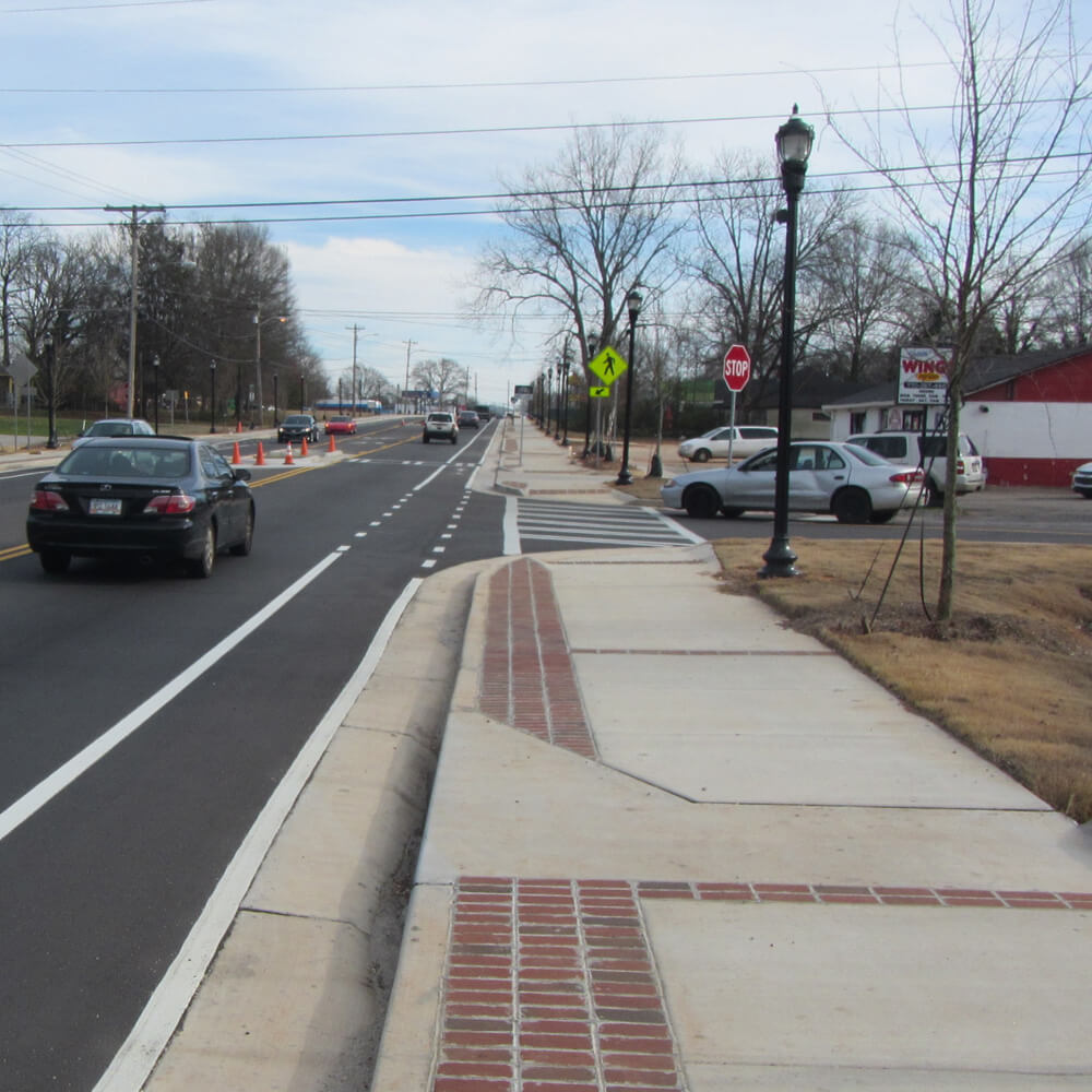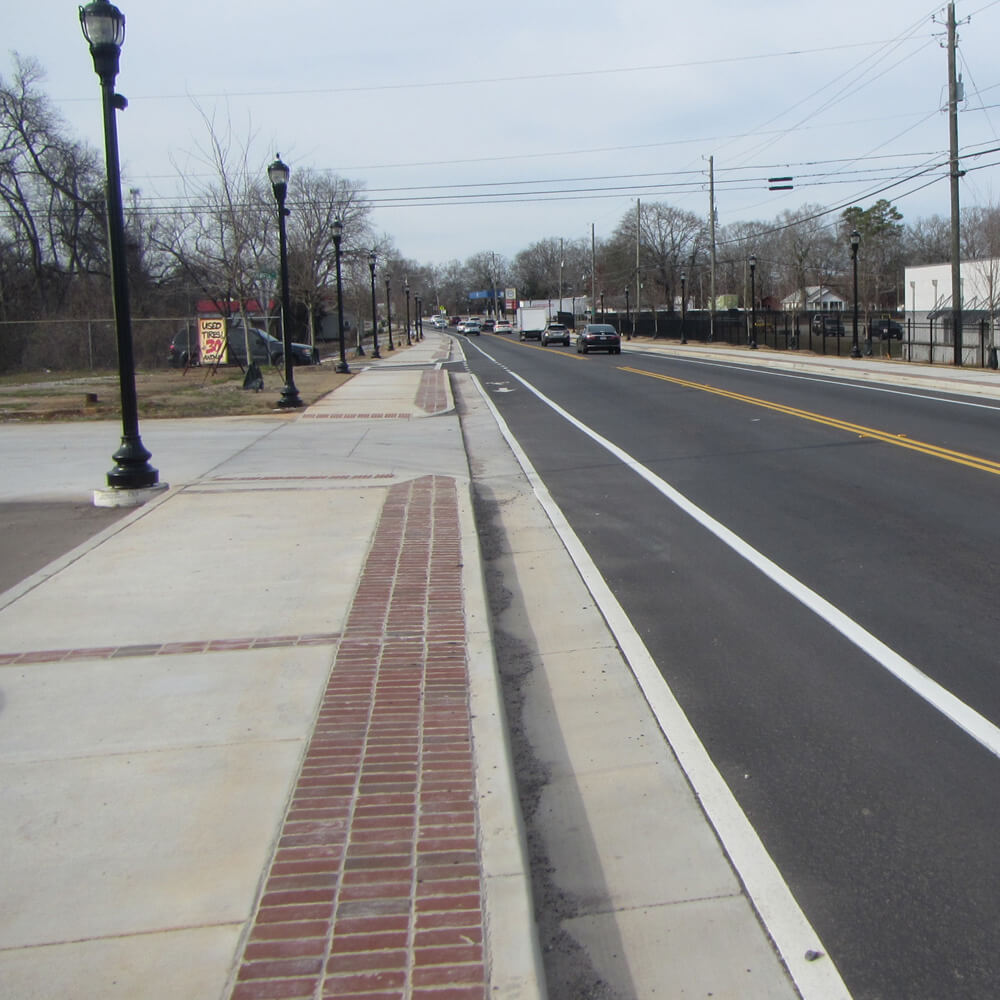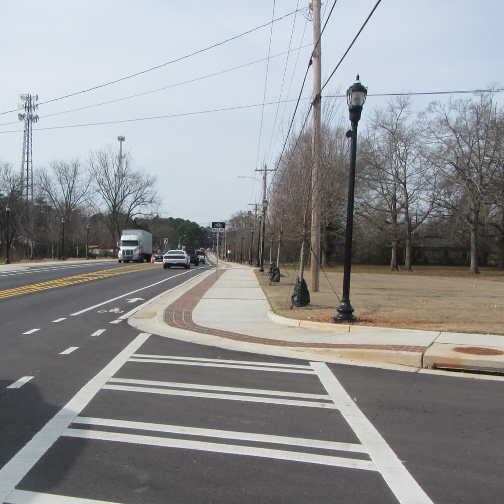 The SR 11/North Broad Street Bicycle & Pedestrian Improvements project included new or expanded sidewalks and new bicycle facilities for 0.58 miles along both sides of the North Broad Street (SR 11) from Marable Street to US 78. The pavement was re-striped to allow for bicycle lanes and wider sidewalks. In addition, the improvements included raised curbs, defined pedestrian crossings at intersections, a mid-block pedestrian crossing, shared lane and dedicated bicycle lane markings, street trees and landscaping, pedestrian scale lighting and other street furnishings, ADA-accessible curb ramps and storm sewer upgrades.