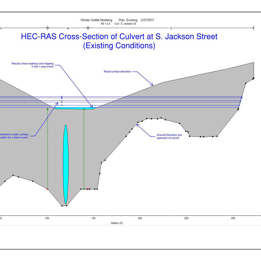 Keck & Wood was hired by the City of Winder in December of 2015 to prepare a Stormwater Master Plan to use as a planning tool for future stormwater projects within drainage basins identified by the city. The scope included a detailed study of four drainage basins with a combined area of approximately 141 acres. Each basin discharges under a CSX railroad. The study also included hydraulic analysis of the outfall paths for each basin studied.