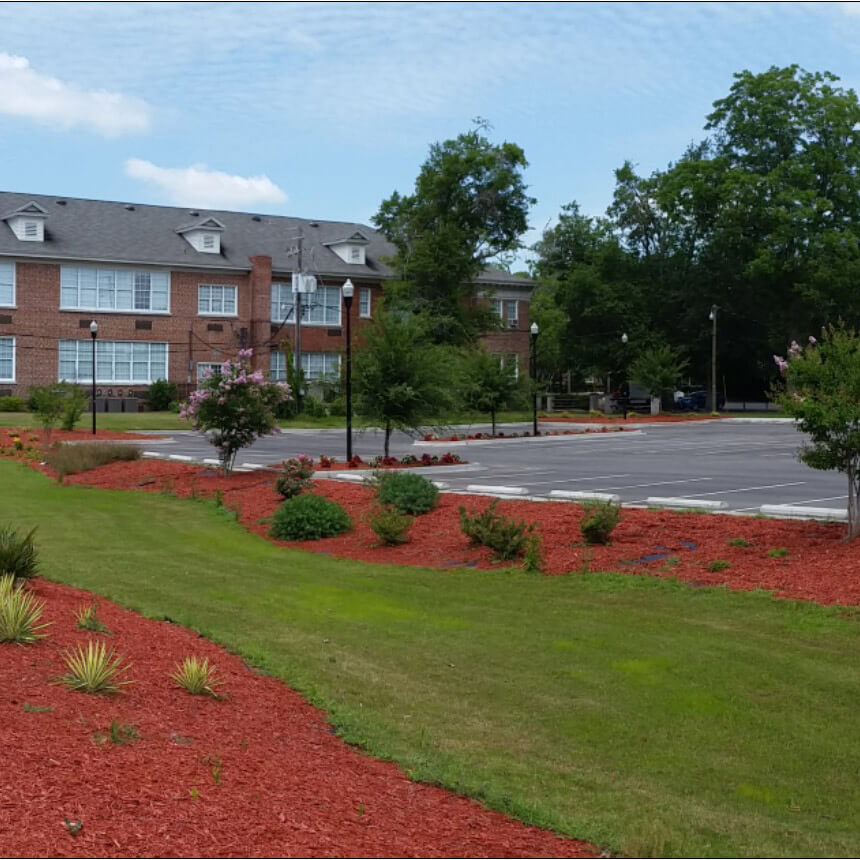 New 63 space asphalt parking lot at the campus Conference Center. Enhanced landscaping was provided in the stormwater detention area because the project is on one of the main roads in Allendale.