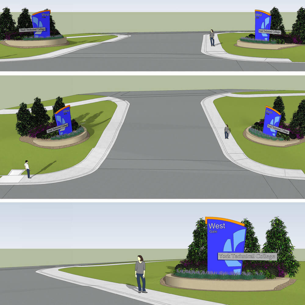 York Technical College wanted to make the East and West entrances to campus more visible by installing signage and landscaping. Keck & Wood created 2D and 3D graphics that allowed campus leaders to visualize what the proposed signs and landscaping would look like. Once the conceptual graphics were approved, we created construction drawings for the improvements.